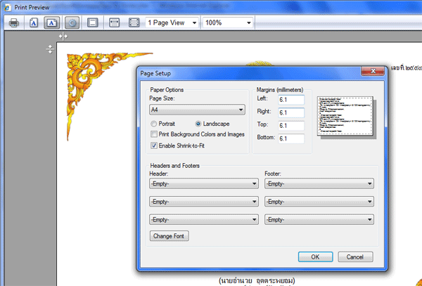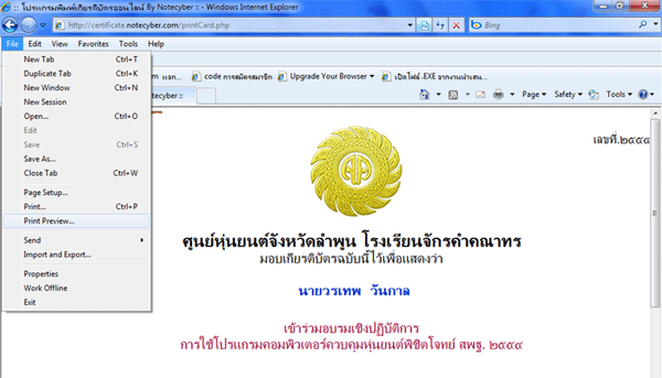 เนื่องจากการเปิดใช้งาน Browser Internet ของท่านมีลักษณะที่แตกต่างกัน ค่าเริ่มต้นของแต่ละเครื่อง หน้ากระดาษจะอยู่ในแนวตั้ง แต่เกียรติบัตรต้องใช้กระดาษแนวนอน ดังนั้นก่อนการสั่ง Print ให้ปรับรูปแบบ ดังนี้